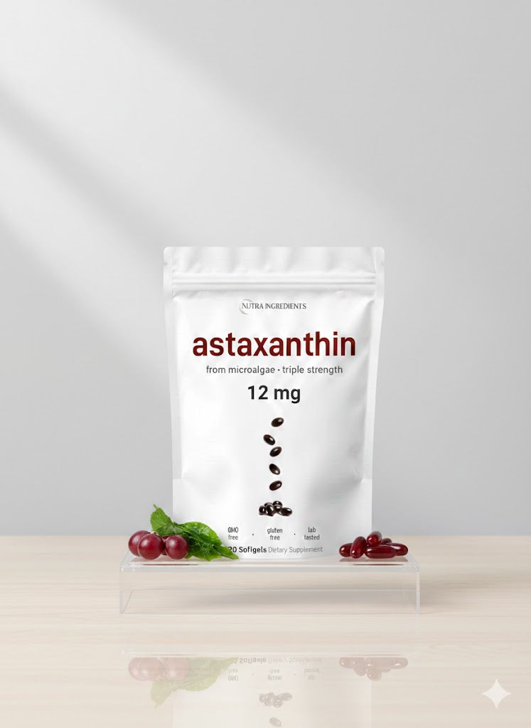 Astaxanthin supports healthier-looking skin by helping reduce UV damage, improve moisture and elasticity, and soften the appearance of wrinkles and age spots